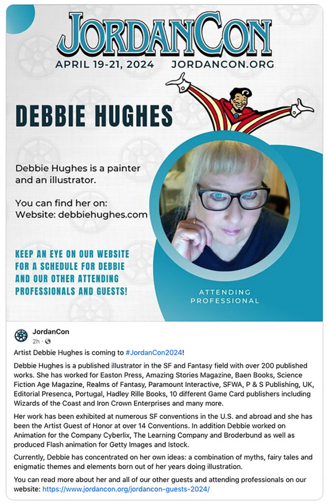 Discon III, Debbie was interviewed by Discon 3 which held the 2021 World Con in 2021. In this interview Debbie talked about her Chesley Award for her Painting, “The Raven, the Wolf and the Maiden. Plus she talks of her influences, her background in book, magazine, game illustration and her upcoming projects. Please check this out on Discon 3 .and her Youtube channel.
